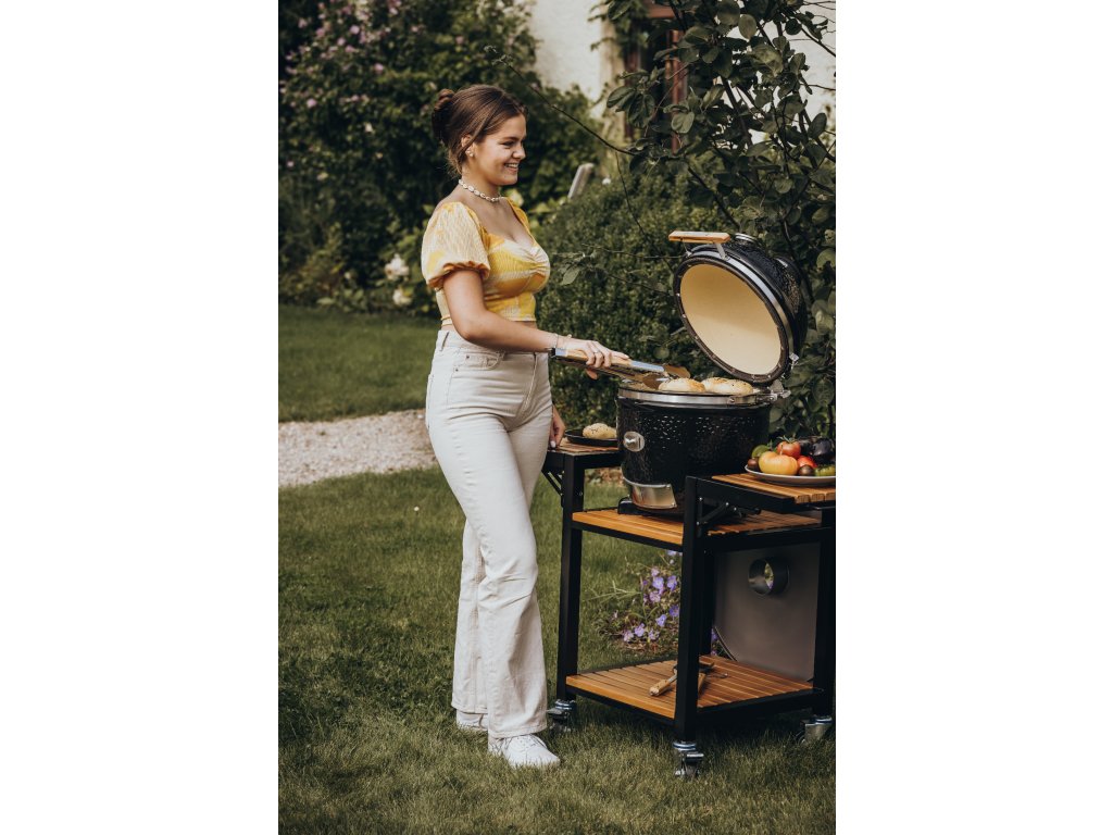 Černý práškově lakovaný rám s postranními stolky z akáciového dřeva dodává malým hvězdám rodiny Monolith Grill stylový mobilní základ.