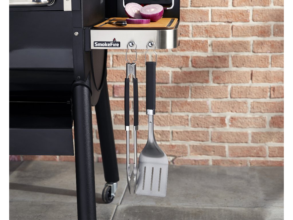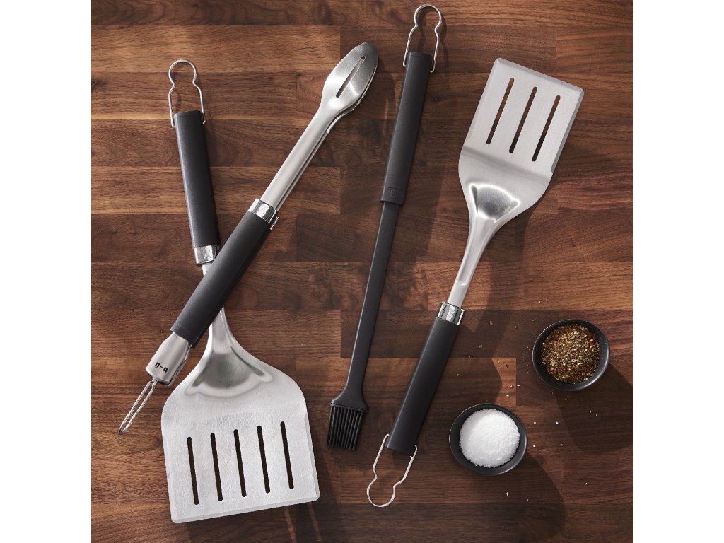 Dvoudílný set z odolné nerezové oceli s měkkým madlem pro komfort a kontrolu. Kleště s hands-free zamykáním mají plochou špici, takže snadno naberete i delikátní kusy jídla. Obracečku se třemi zkosenými hranami snadno zasunete pod jídlo. Oba nástroje lze mýt v myčce.