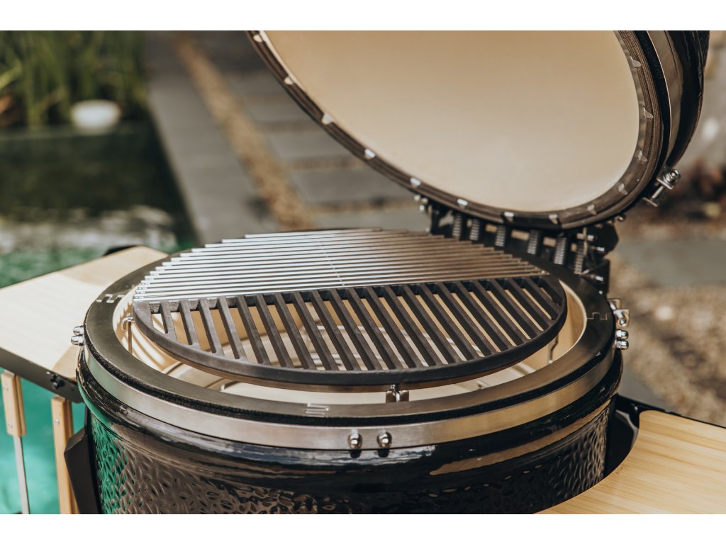 - Flexibilním nastavitelným systému roštů SGS (tzv. Smart Grid System) v základní výbavě: Díky SGS můžete použít různé techniky grilování ve stejnou dobu. Grilovací plochu můžete rozdělit na přímou a nepřímou zónu. Např. na jedné straně můžete opékat steaky a na druhé připravovat přílohu v litinovém hrnce. Součástí SGS je dělený nerezový grilovací rošt, dělený deflektorový kámen a také odkapávací misky.