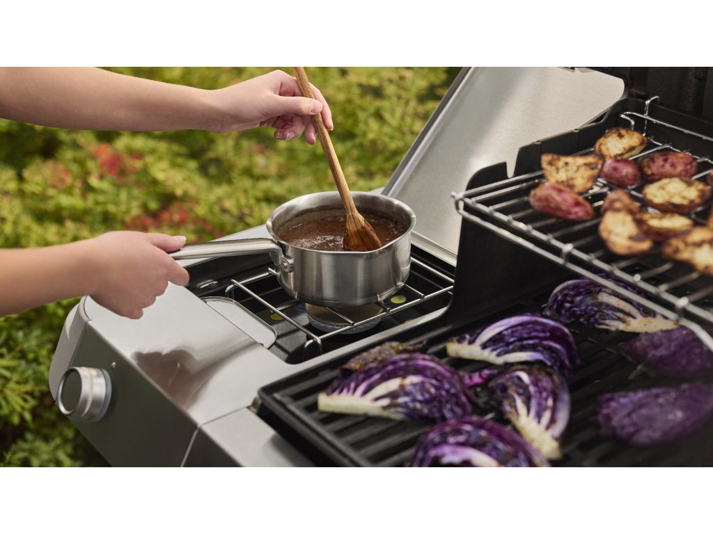Gril je vybaven integrovaným digitálním teploměrem, světlem v madle pro grilování i večer, elektronickým zapalováním a extra velkým postranním stolkem kompatibilním se systémem Weber Works. Praktická boční skříňka nabízí prostor pro uložení většího příslušenství. Čtyři otočná kolečka zajišťují snadnou manipulaci.