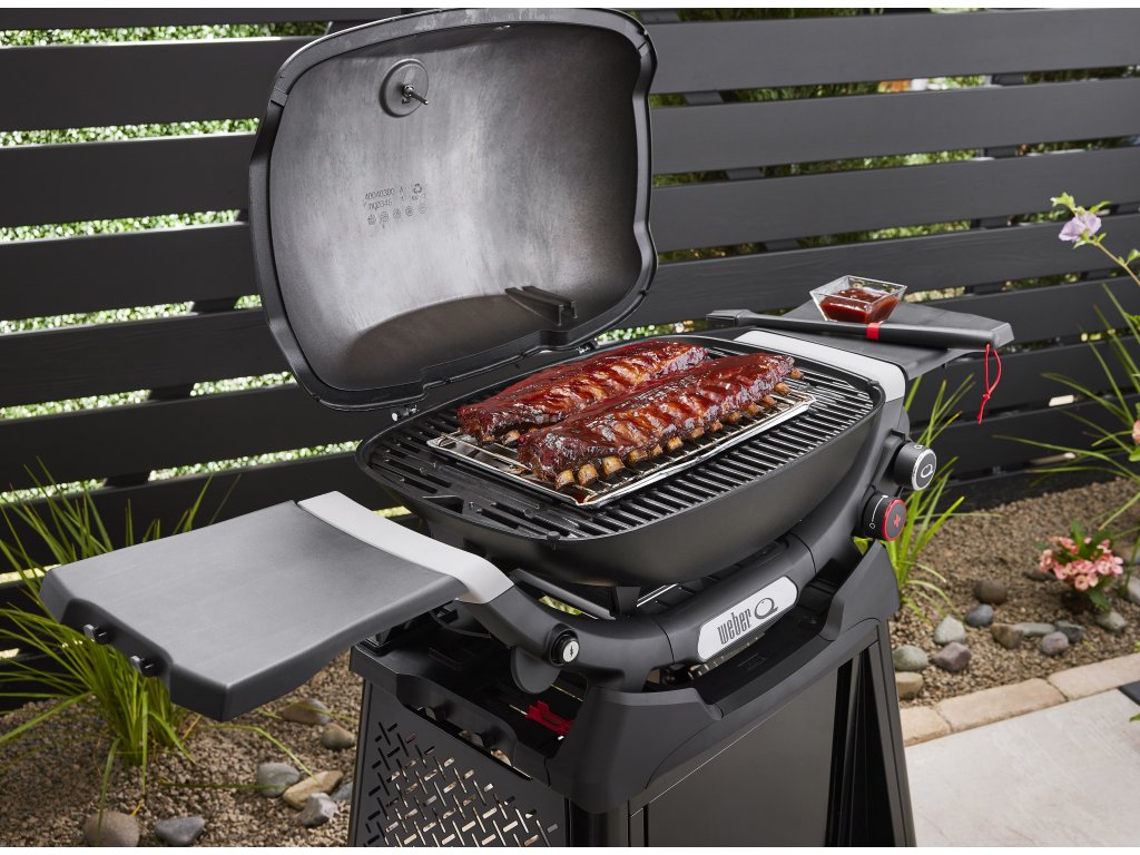 Součástí je vylepšený prémiový stojan s uzavřeným kovovým vozíkem, předními dvířky a prostorem na plynovou láhev, který zajišťuje stabilitu i dostatek místa pro uložení příslušenství. Odnímatelné boční stolky, háčky na náčiní a čtyři uzamykatelná kolečka přinášejí maximální pohodlí při manipulaci i grilování.